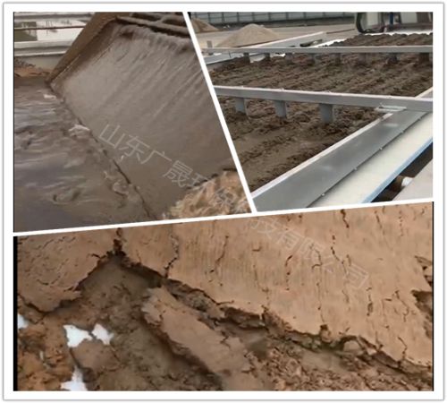 洗沙污泥怎么处理实施办法, 经絮凝的污泥首先进入重力脱水区,随着滤带的运行,污泥进入由两条滤带组成的楔形区,污泥逐渐增稠,流动性降低,过渡到压榨区;上下滤带经卸料辊分离,凭借滤带曲率的变化并利用刮刀将滤饼刮落,实现物料的固液分离。