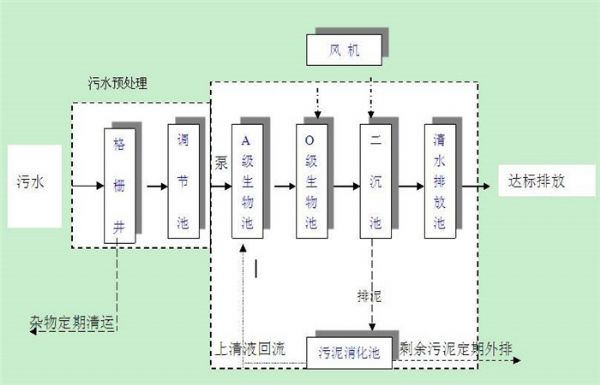 农村污水处理经格栅后进入水解酸化池(调节池)进行水质水量调节出水经提升泵提升至厌氧生物池(兼氧池A),出水进入一级接触氧化池(0)生化后再进入二级接触氧化池(0)继续生化后,进入沉淀池进行固液分离后经加入消毒.剂后进入接触消毒池,经一定的接触时间后消毒出水即可达标排放。
