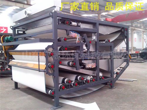 高岭土泥浆脱水机的作用就是把千分之几的含固率污泥,与一定浓度的絮凝剂在静态混合器中充分混合以后,污泥中的微小固体颗粒聚凝成体积较大的絮状团块,同时分离出自由水,被输送到本机浓缩段,在重力作用下,自由水被分离,形成不流动状态的污泥,然后夹持在上下两条网带之间,进入本机的脱水段,经过楔形区,低压区和高压区,在由小到大的挤压力的作用下,进一步挤压污泥,以达到脱水的目的, 后污泥与水分离,形成滤饼排出,方便储放和运输。